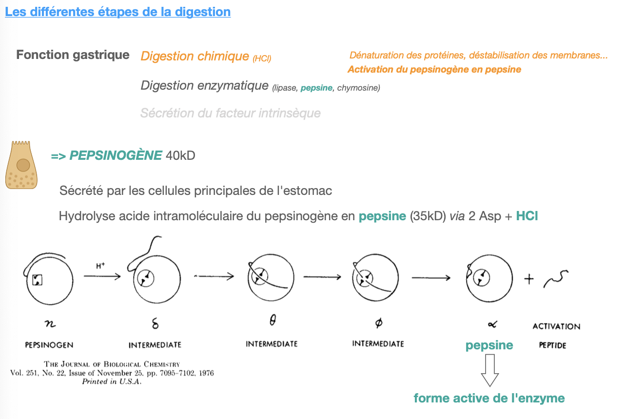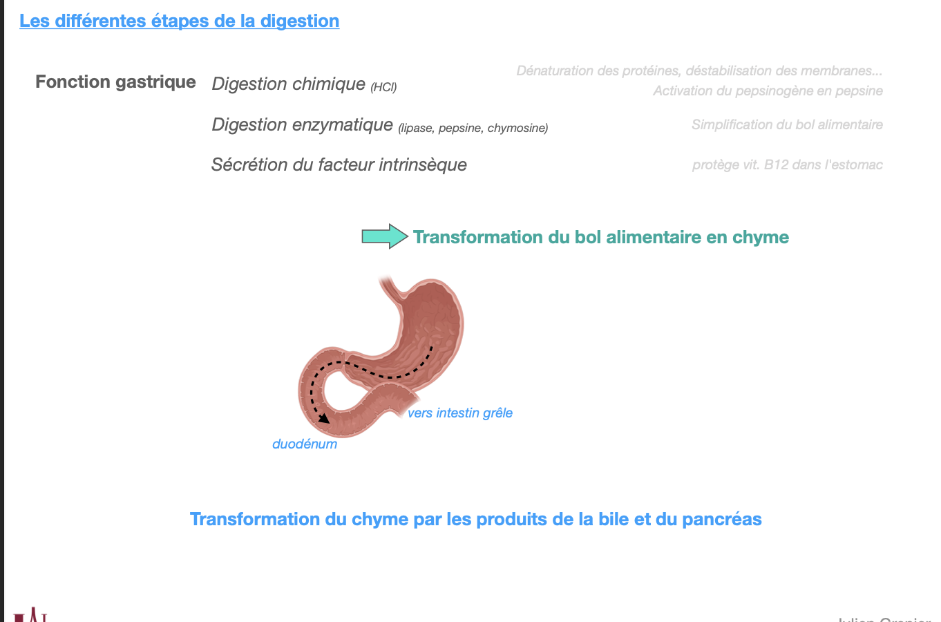 Digestion chimique (HCl) → dénaturation des protéines, activation du pepsinogène, destruction bactérienne.