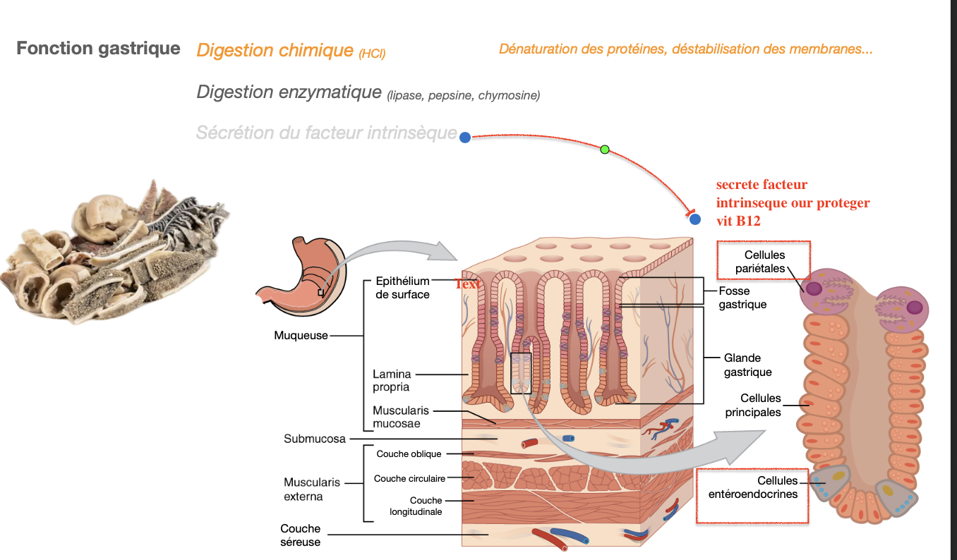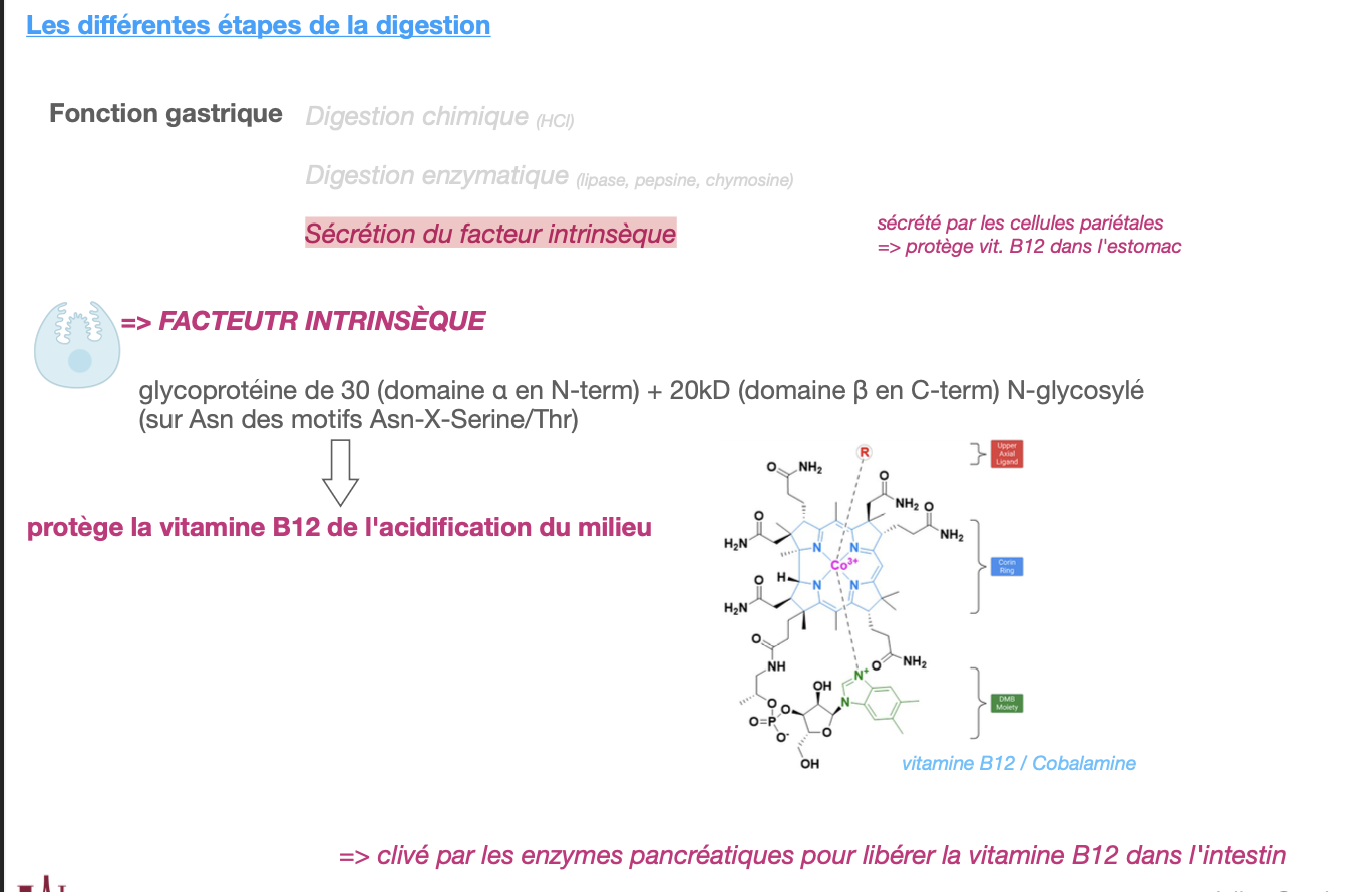 Sécrétion du facteur intrinsèque → protège la vitamine B12 et permet son absorption iléale.