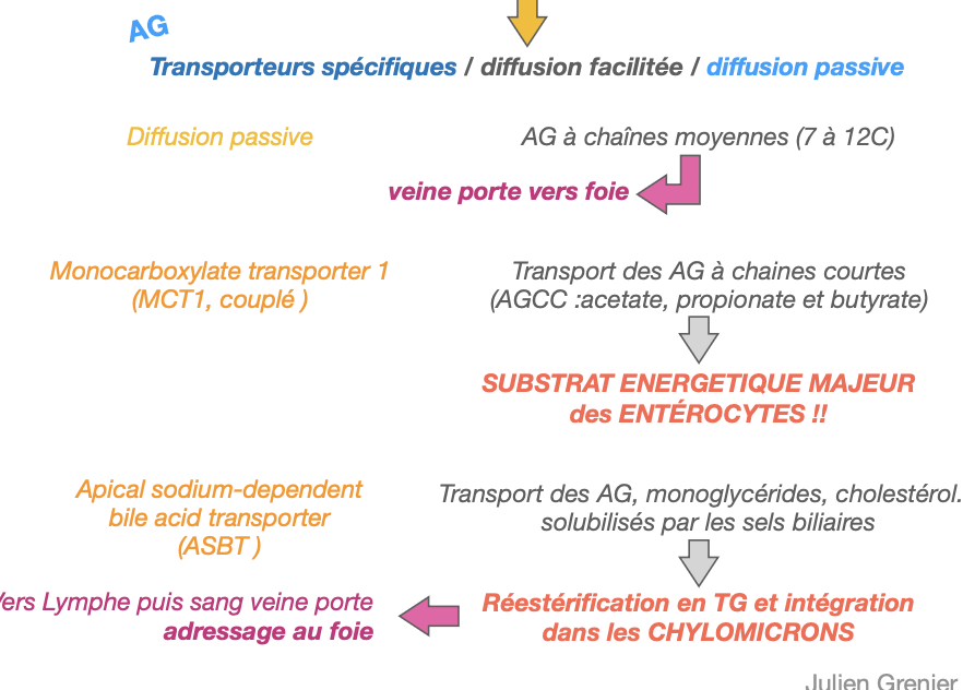 AG à chaînes courtes (C2–C6) → diffusent passivement dans les entérocytes via MCT1 (Monocarboxylate Transporter 1) ; ils servent de substrats énergétiques majeurs aux entérocytes.