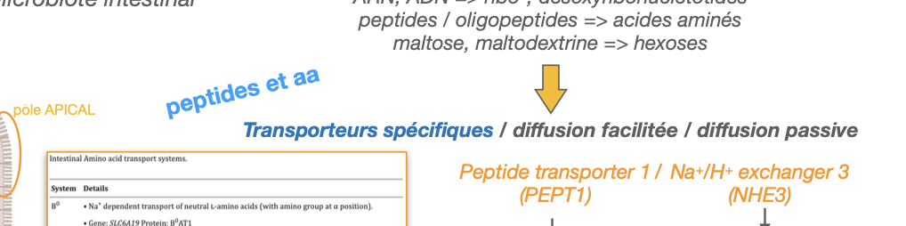 PEPT1 (Peptide transporter 1) : co-transport H⁺/di- ou tripeptides au pôle apical.