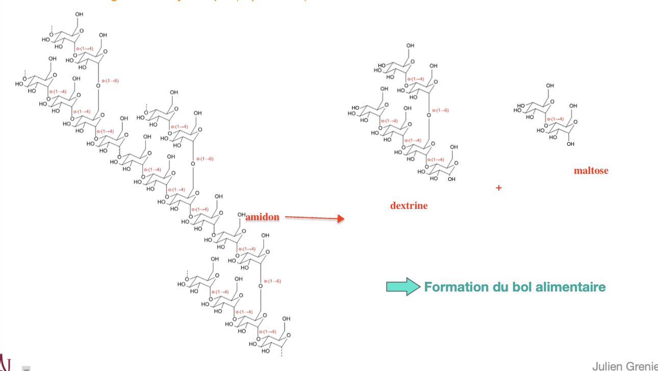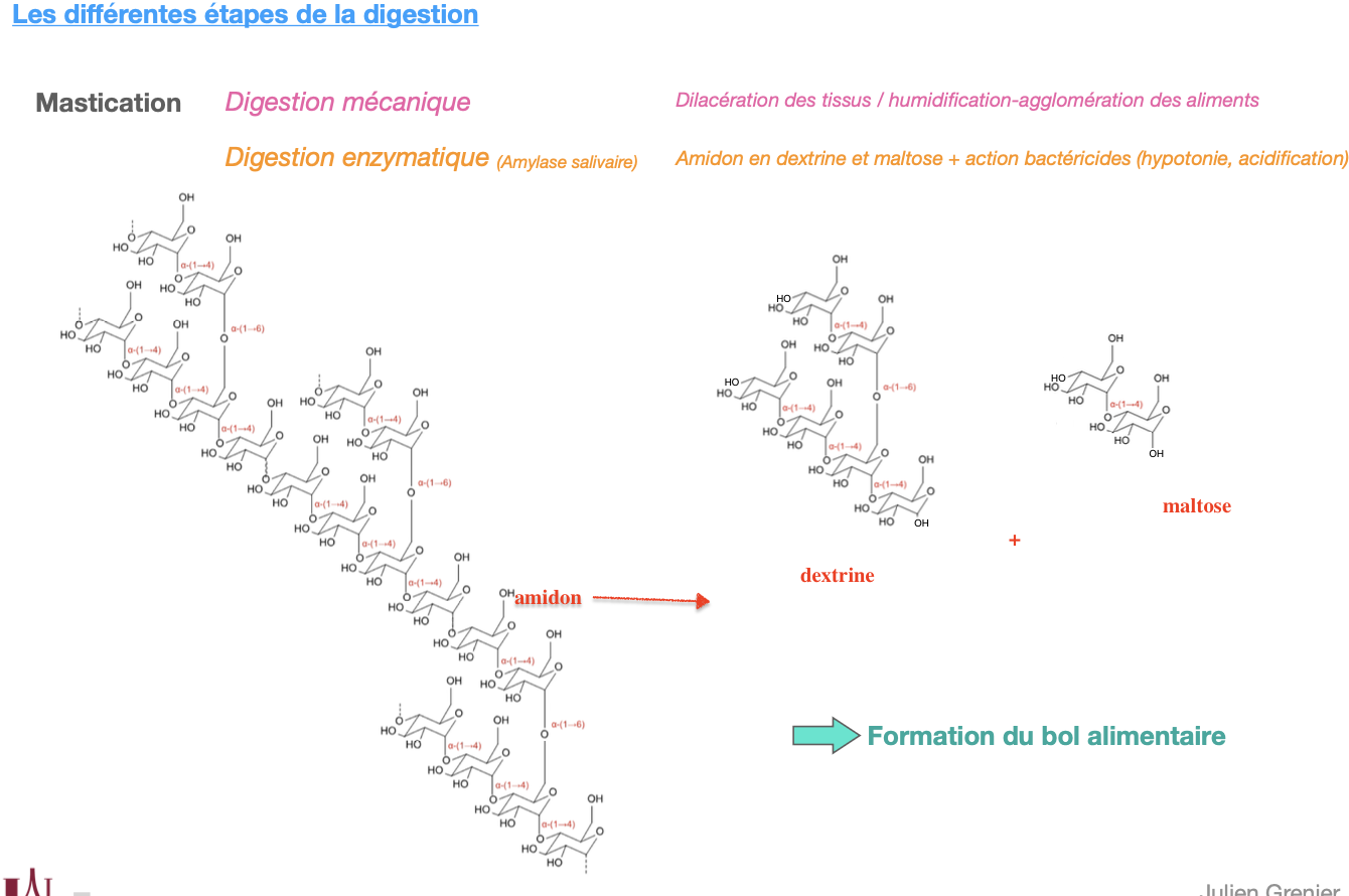 Comment ? Action mécanique des dents et de la langue + action chimique de l’amylase sur les liaisons α(1→4) de l’amidon à pH ~7 (inactive ensuite dans l’estomac acide).