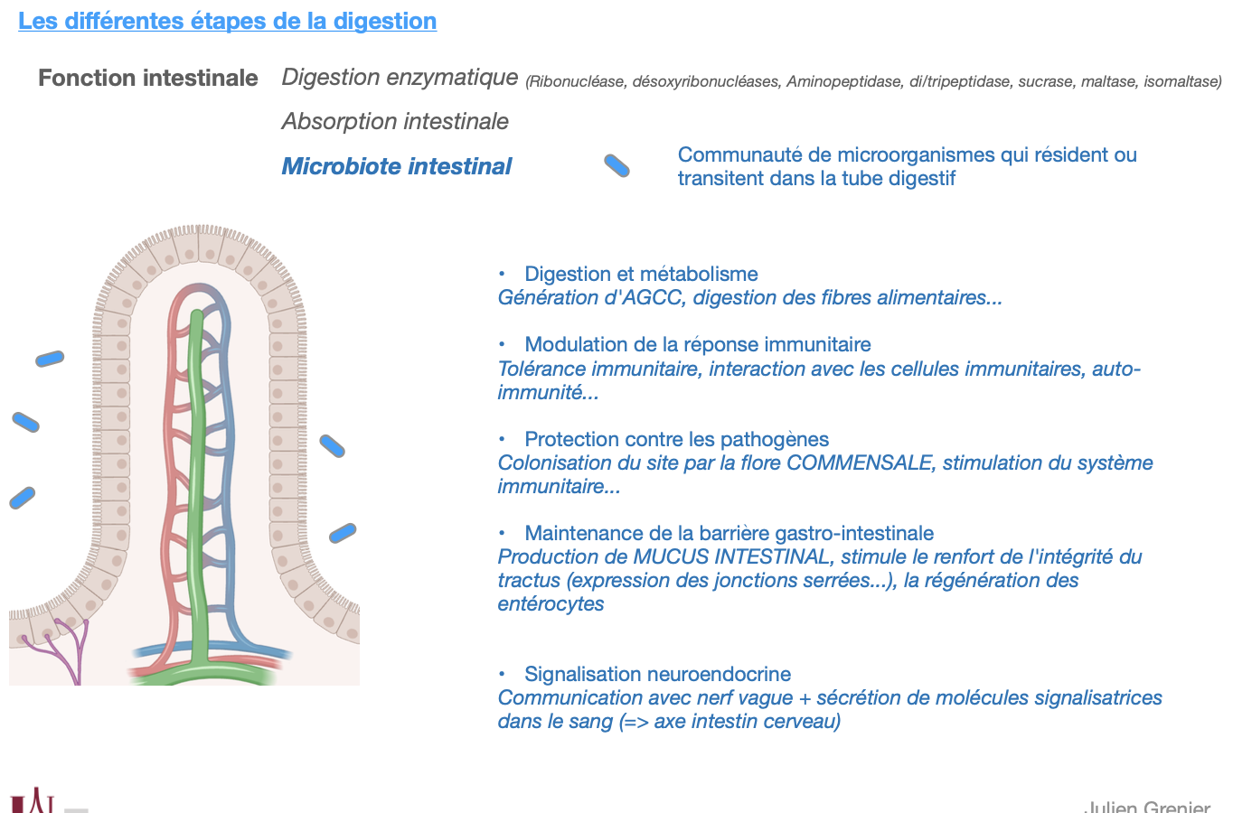 Digestion & métabolisme : fermentation des fibres → AGCC (acétate, propionate, butyrate = carburant des colonocytes) ; métabolisme des acides biliaires, synthèse de vitamines (K, B7/biotine, B9…).