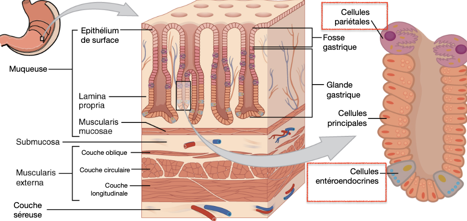 Sécrète le suc gastrique (HCl, pepsinogène, facteur intrinsèque, mucus).