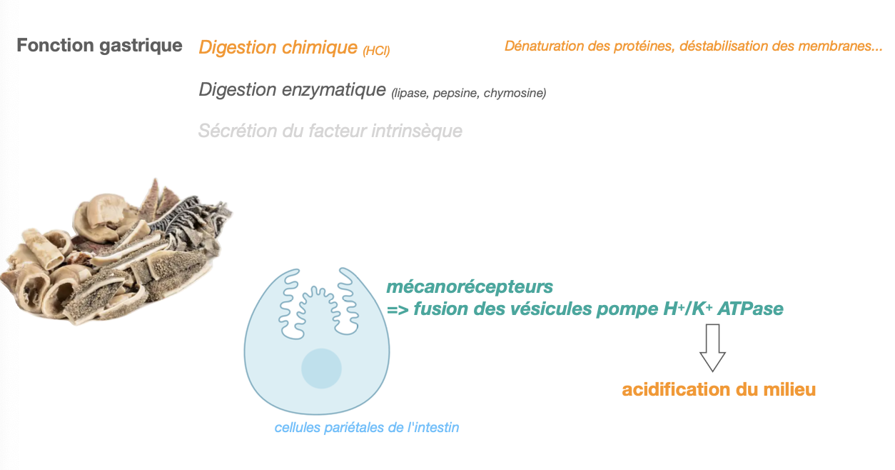 Digestion chimique : production d’HCl par les cellules pariétales → acidification du milieu (pH ≈ 1–2).