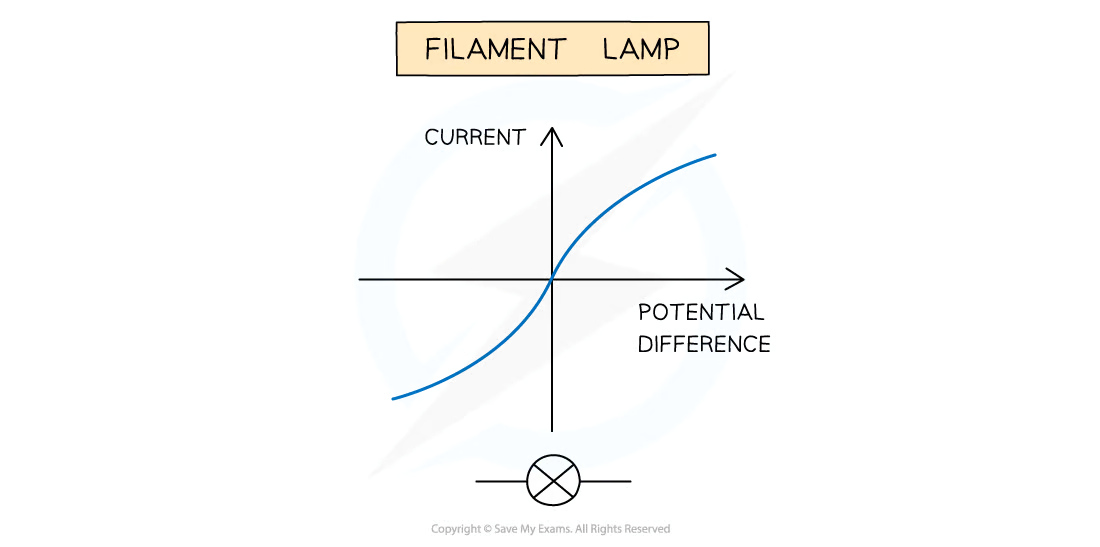 Explain the I-V characteristic of a filament bulb or hot conducting wire.