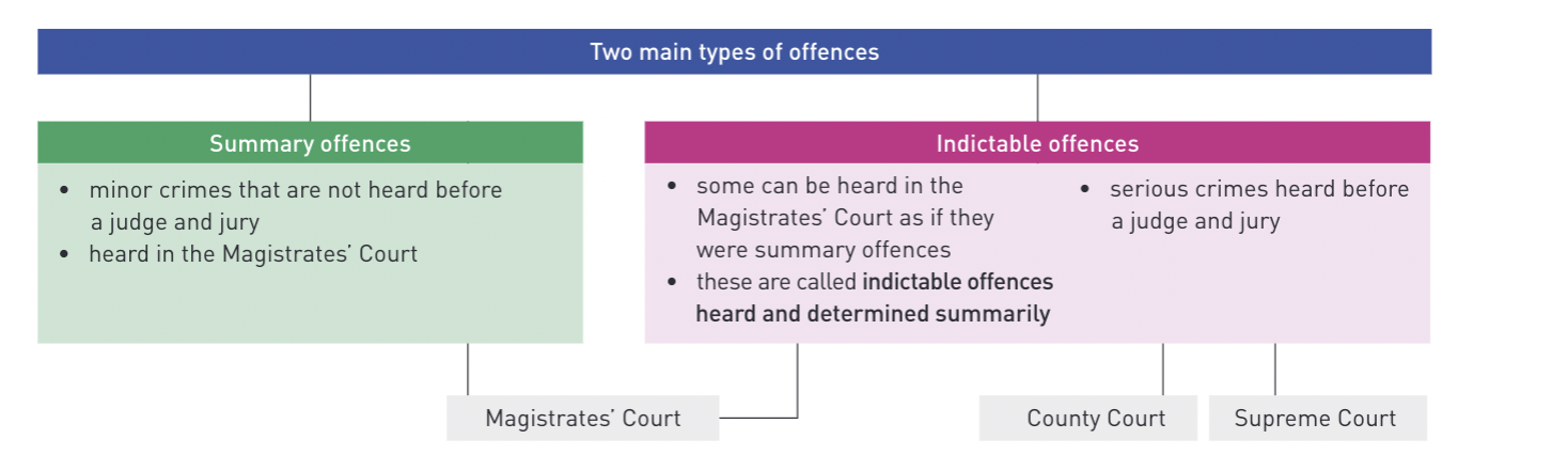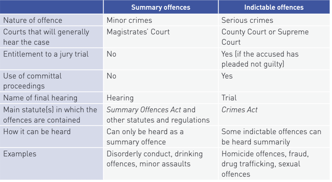 In a criminal case involving summary offences, the case is heard in the Magistrates' Court and a magistrate (not a jury) will decide on guilt. If the burden of proof is on the accused (e.g. the accused is relying on a certain defence), then the standard of proof is on the balance of probabilities.