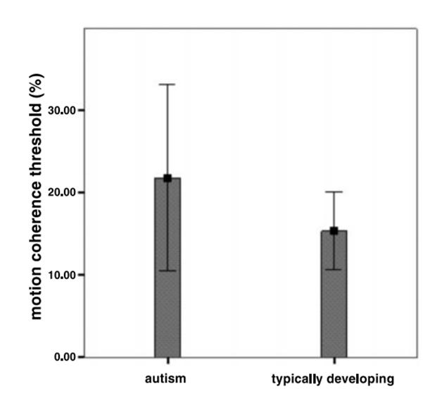 -in autism needed to see a higher proportion of dots moving in the same direction in order to identify it → so have higher motion coherence threshold