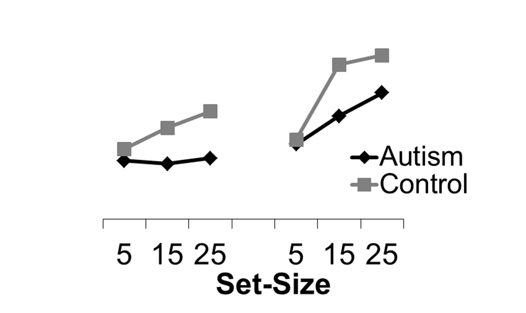 Visual Search | ![]() | Faster performance in autism than NT (O’Riordan et al.) |