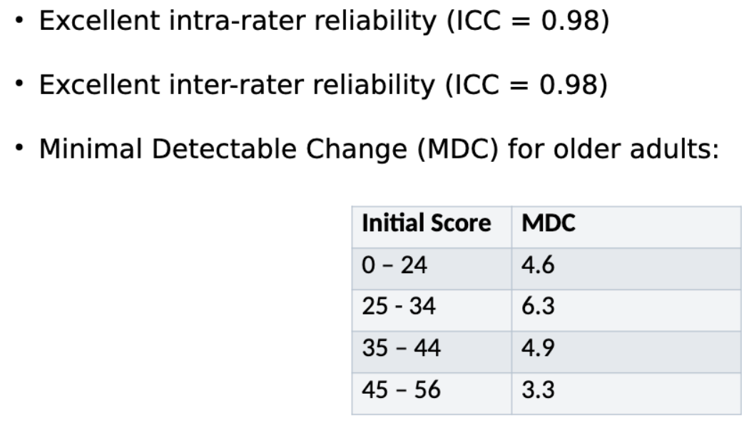 < 45 on BBS indicates an individual may be at increased risk of falls and may benefit from a walker or other walking aid.