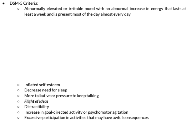 It is a disorder characterized by exaggerated pleasure or joy in every activity, hyperactive behavior that requires little sleep, develops grandiose plans, and has rapid speech that may become incoherent.