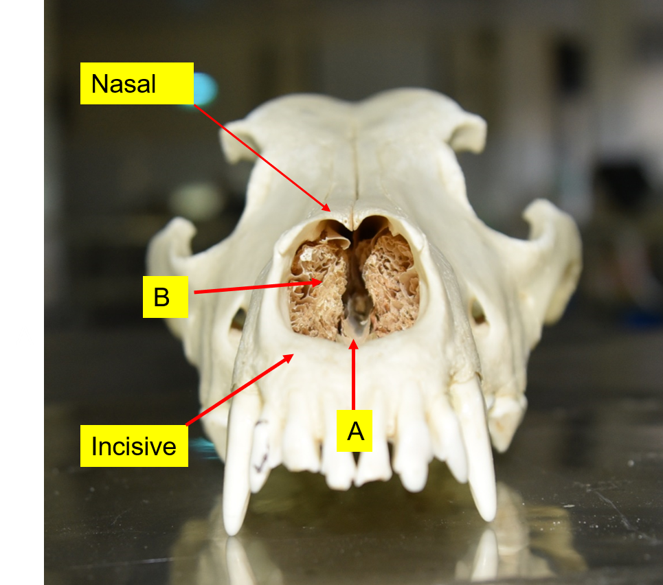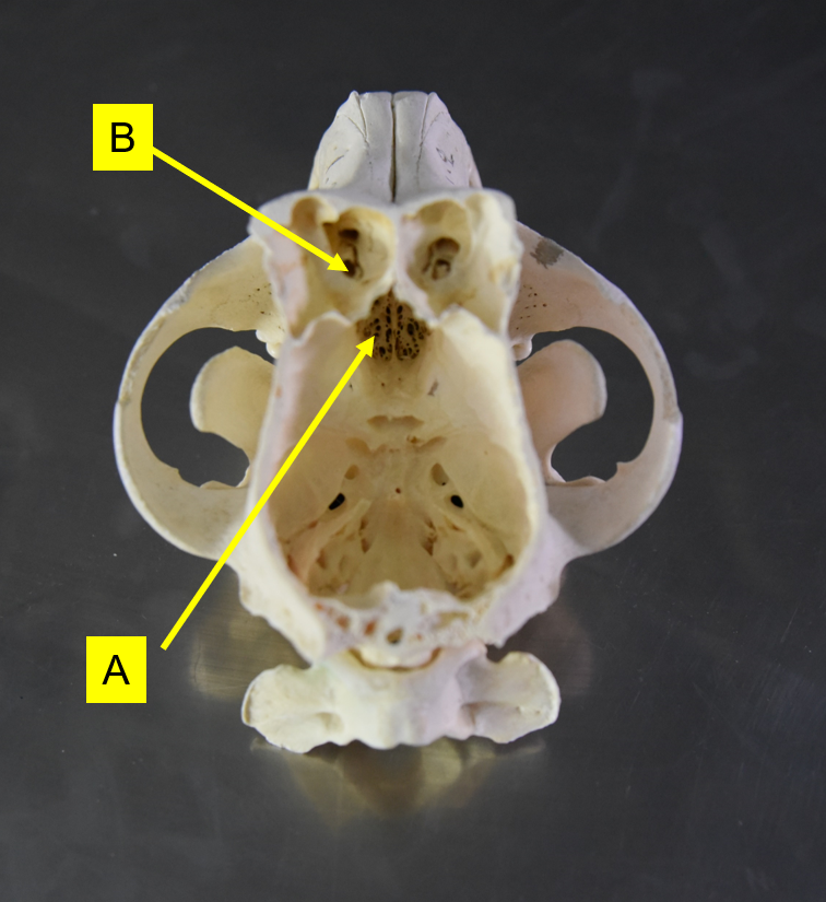 Identify the bones that form the hard palate in this image (from rostral to caudal).
