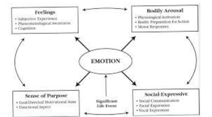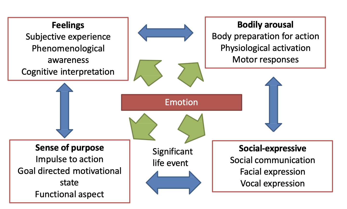 Emotions are short-lived, feeling–arousal–purposive–expressive phenomena