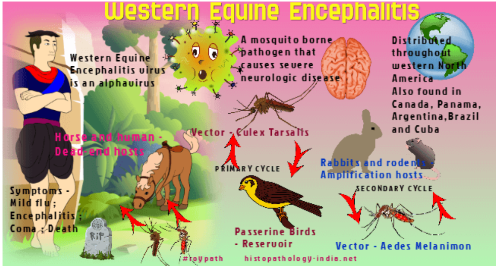 Pathology: Birds get hemorrhage, encephalitis necrosis, horse - encephalomyelitis + neural degeneration
