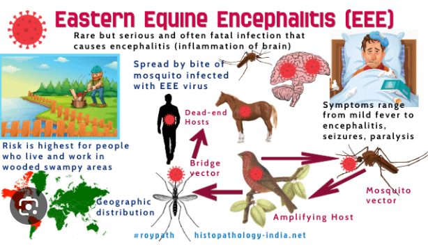 All → involve birds and mosquitoes in transmission, but EEE and WEE are classically bird → mosquito → horse cycles, while VEE is more complex, and does not rely primarily on birds. VEE may have rodent → mosquito → horse → human outbreak cycle.