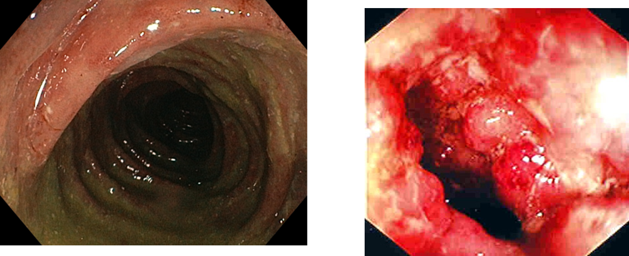 Right is Crohn's – lots of inflammation and quite narrow due to build up of scar tissue.