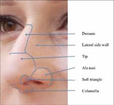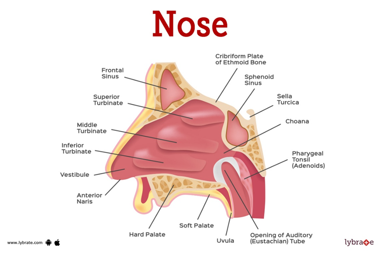 Superior turbinate, middle turbinate, inferior turbinate, vestibule, nasopharynx, opening to the eustachian tube