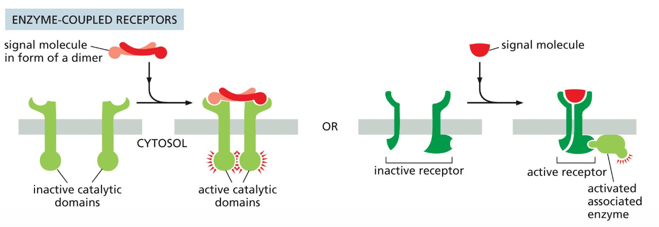 (Receptor tyrosine kinases) - these receptors either act as enzymes or associate with enzymes inside the cell and when they are stimulated then they can activate many intracellular pathways.
