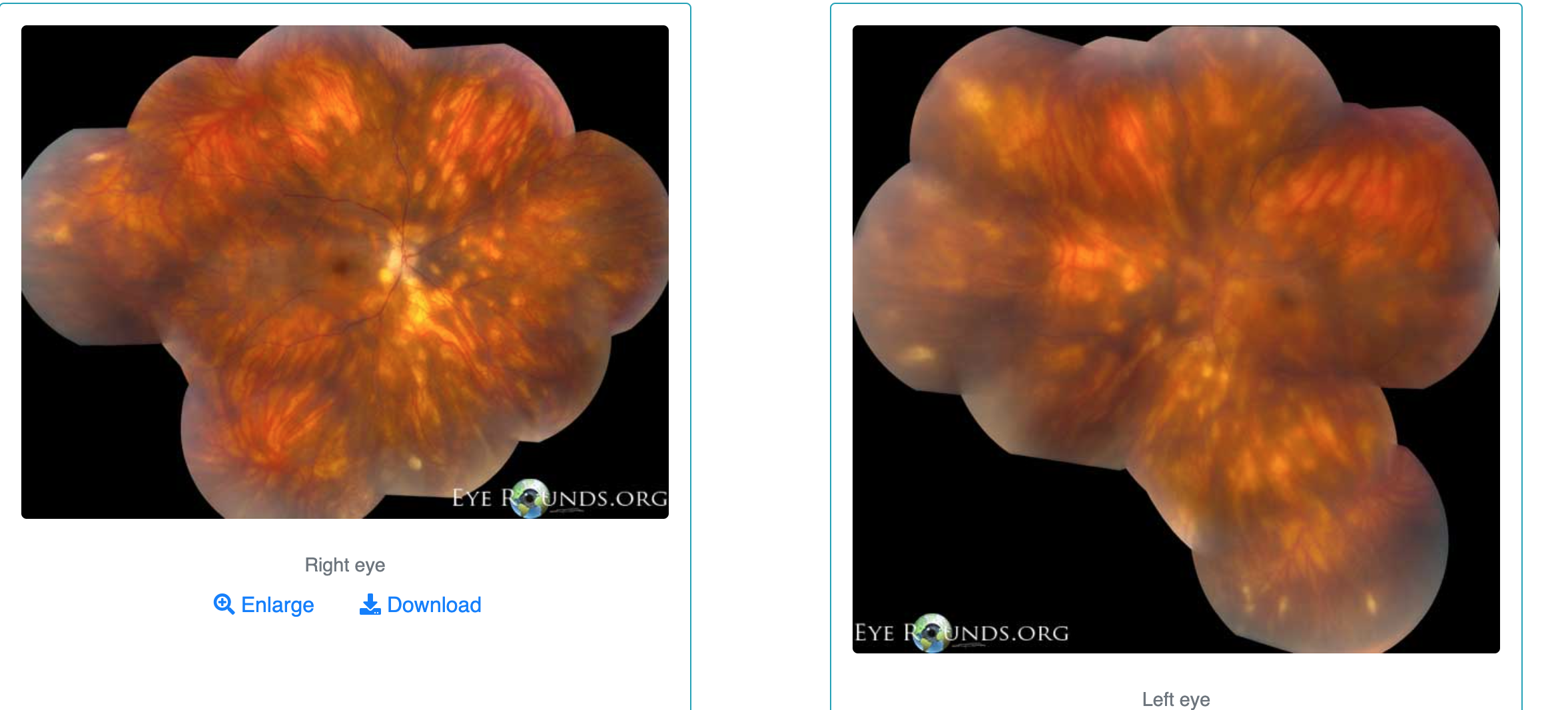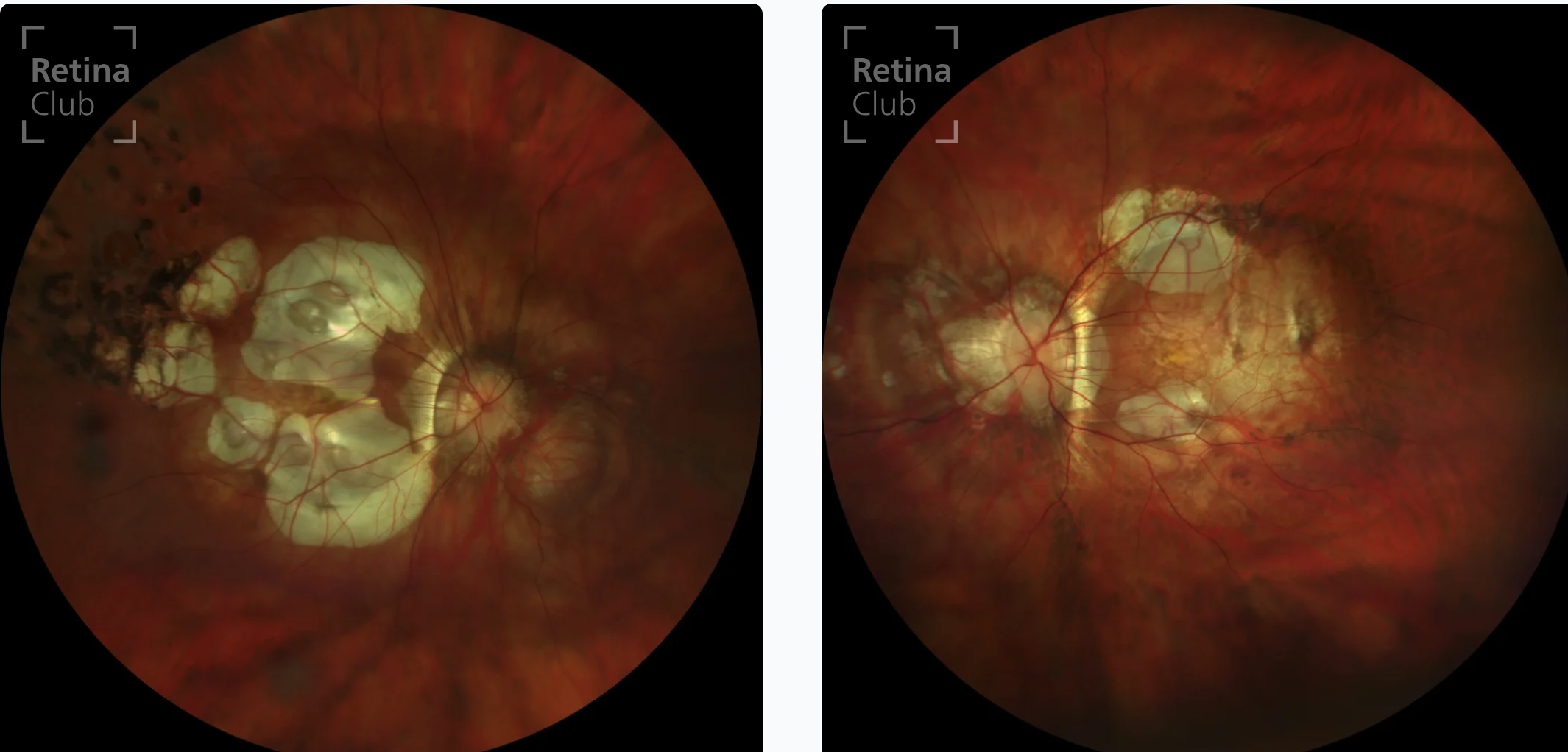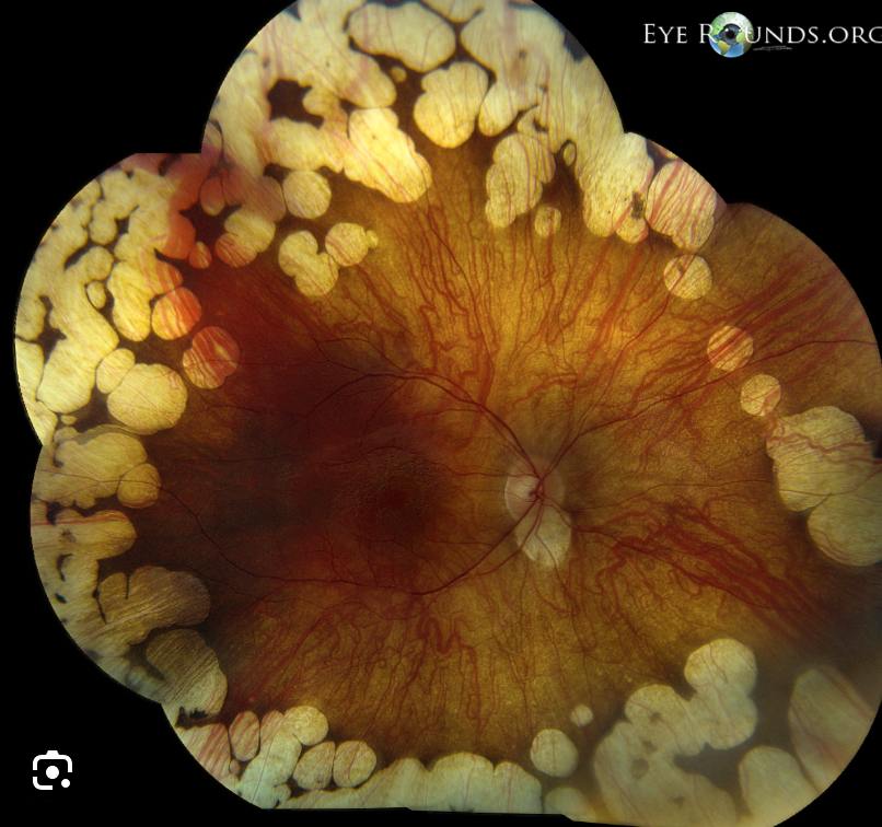 Coats' Disease | Massive "Puddles"; Young boy; Lightbulb vessels | Laser/Cryo to vessels | Exudative RD |