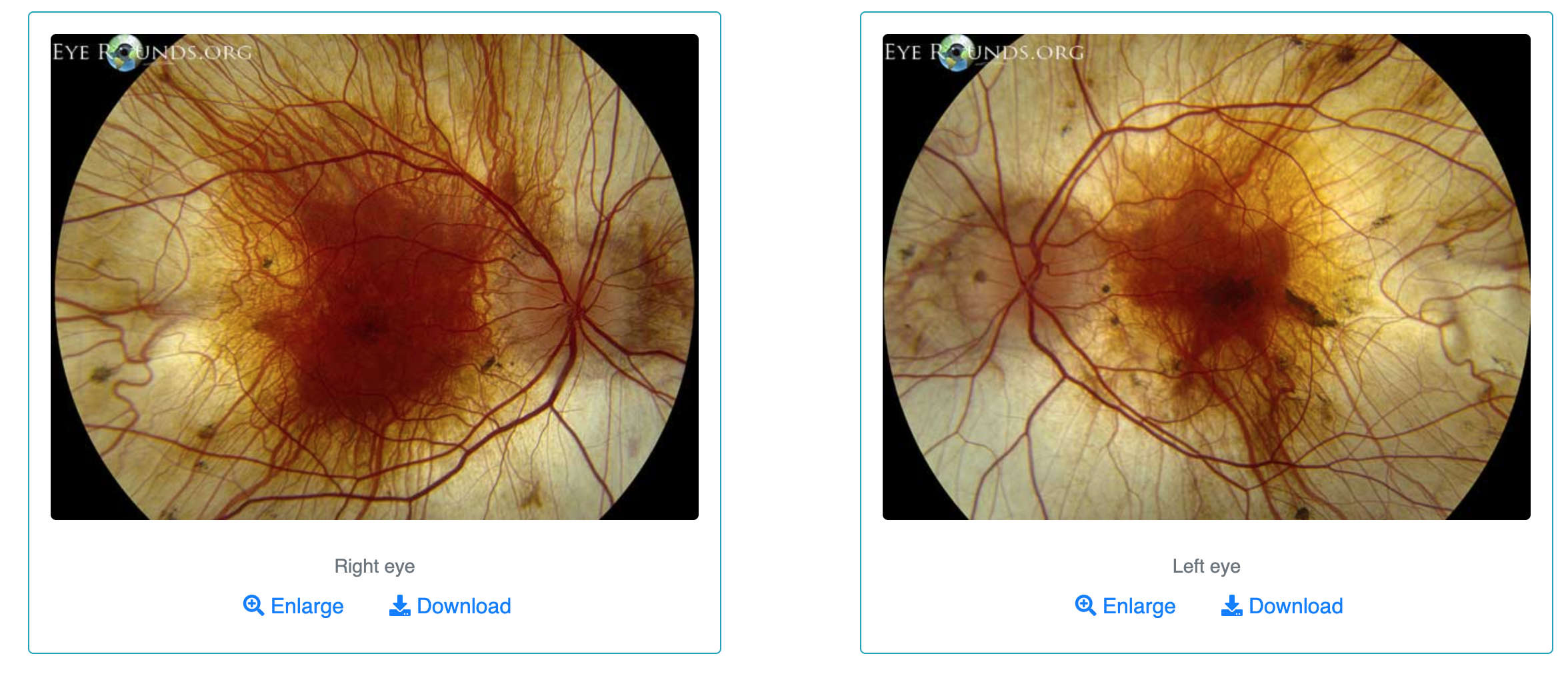 Signs: Bilateral exudative RDs, "sunset glow" fundus + systemic signs: hearing loss (tinnitus) or vitiligo (white patches of skin/hair)