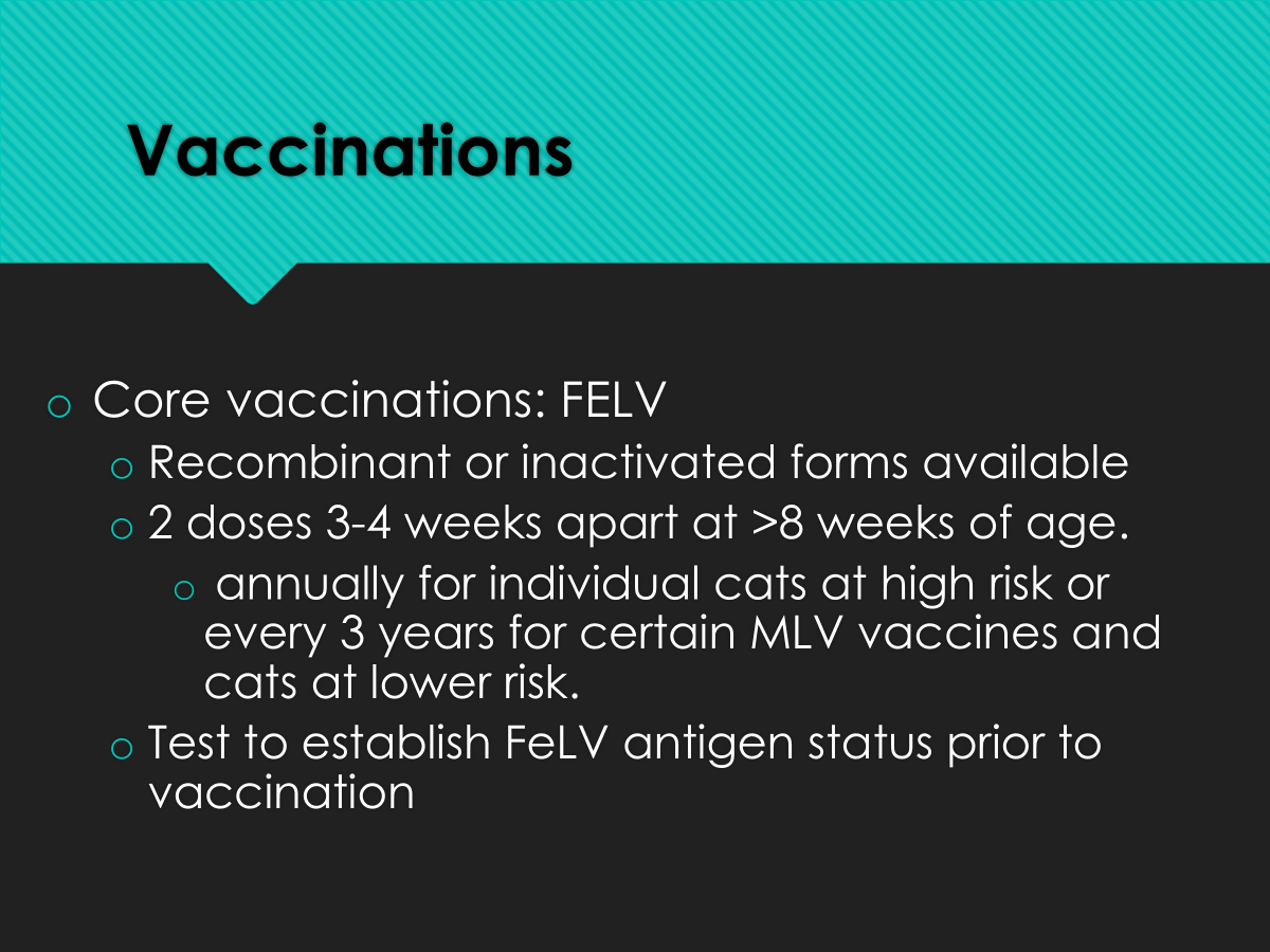 < 16 weeks, one dose of modified live virus (MLV) FHV1, FCV, and FPV recommended every 3-4 weeks from 6-8 weeks of age, with final no sooner than 16 weeks of age