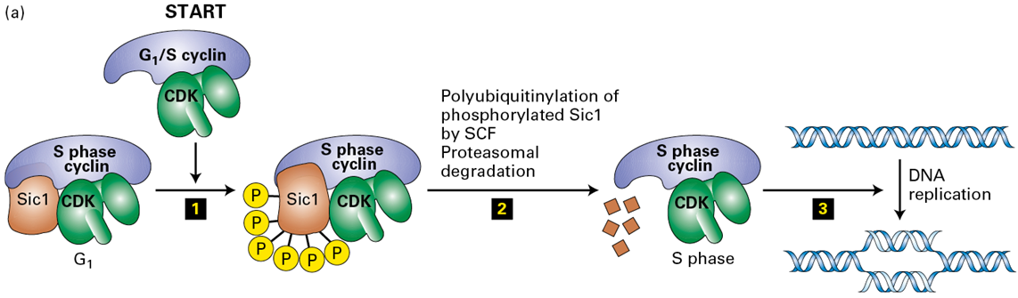 by phosphorylating the CDK inhibitor Sic1 (or p27 in mammals), targeting it for ubiquitination and subsequent degradation by the SCF ubiquitin ligase complex