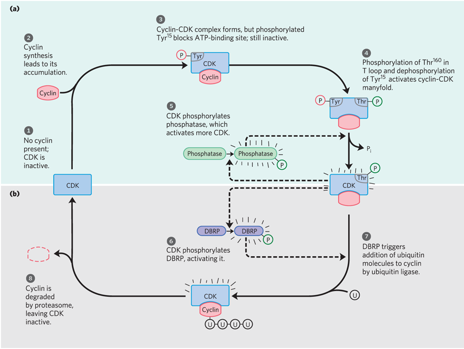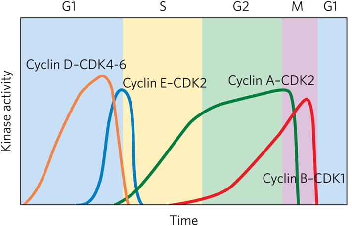Family of kinases controls cell cycle timing with each active kinase having one catalytic subunit ( cyclin dependent kinase (CDK) and one regulatory subunit (cyclin).