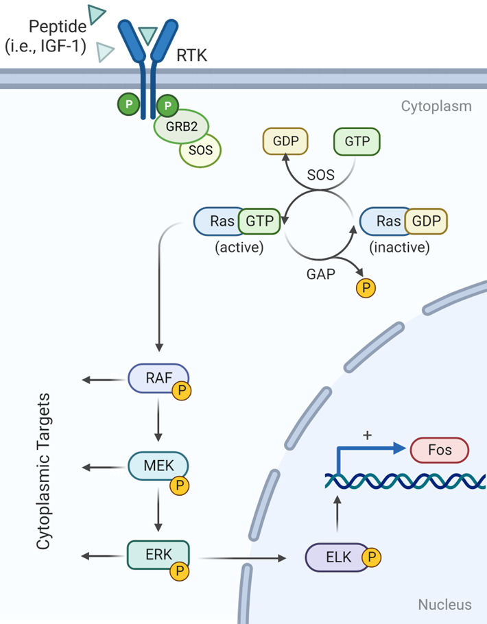 The RAS dependent pathway is activated by RTKs for many growth factors, such as IGF-1, EGF, and PDGF