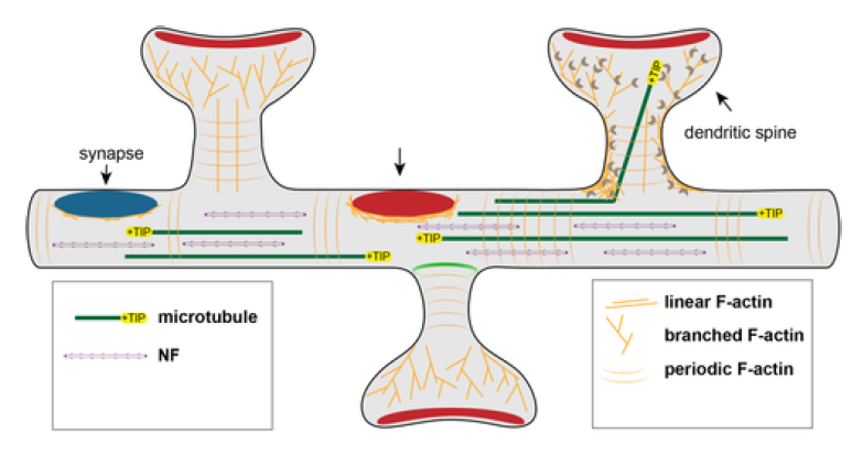 microtubules, surtout presentes dans les dendrites, moins dans les epines. permettent le transport (vesicules etc) et une stabilisation mecanique. Importants pour la croissance des dendrites