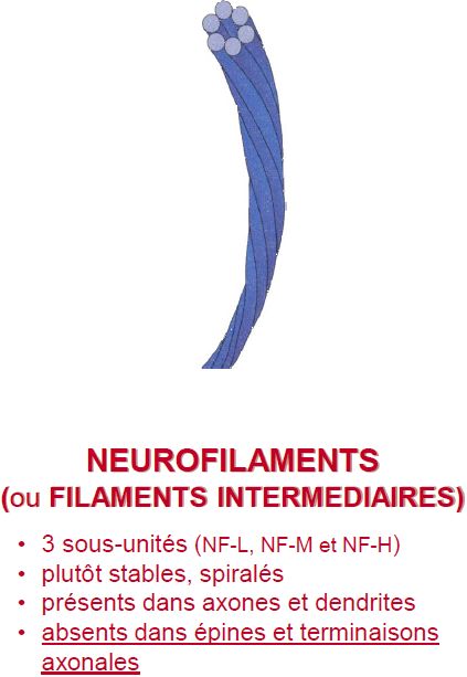 NF = neurofilaments beaucoup plus minces, qu on retrouve que dans les dendrites. Importants pour la croissance des dendrites