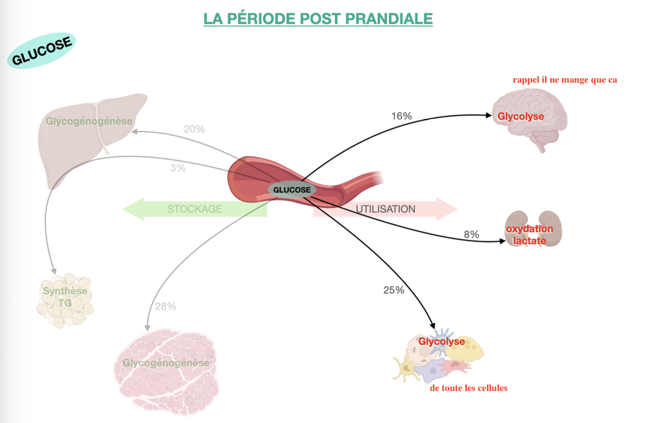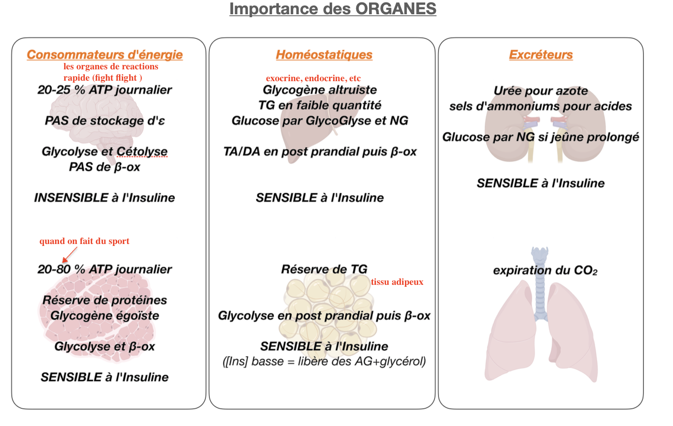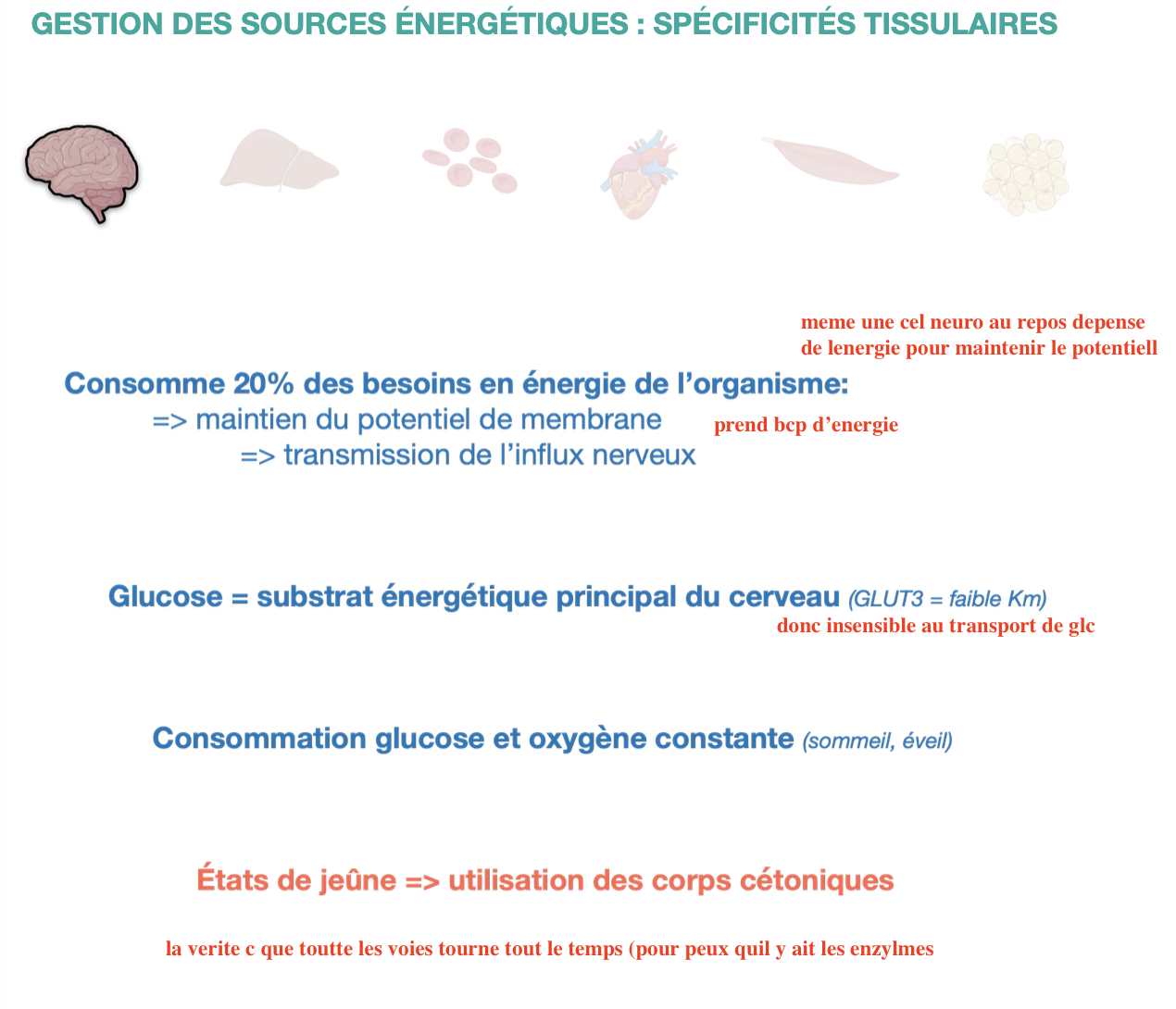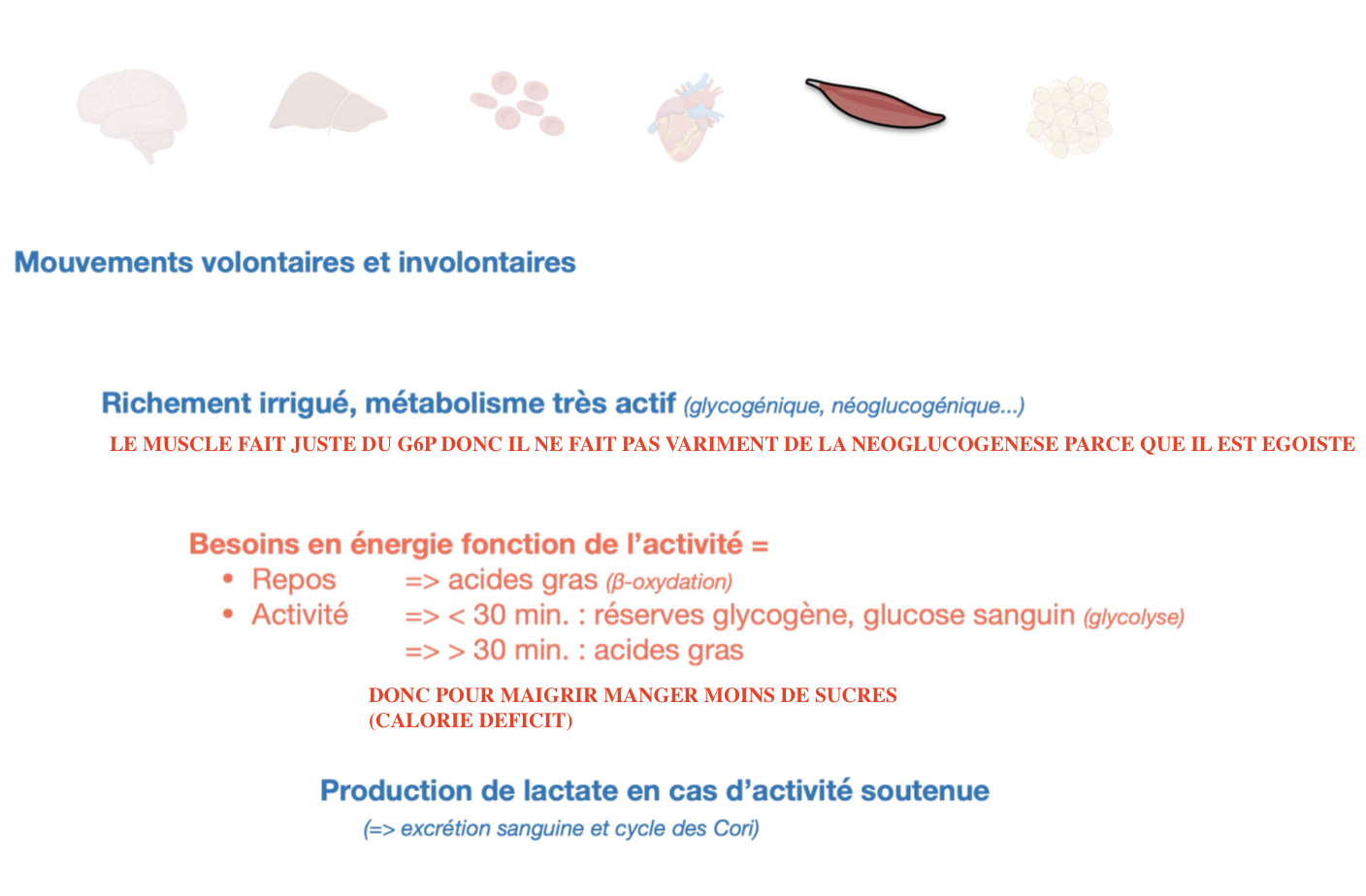 les sucres (glucoses) sont consommés uniquement par les muscle et le cerveau→ parce que ce sont les deux organes qui sont reactifs (fonctionnement TRES TRES RAPIDE (ex quand tu reveille en petard le matin)