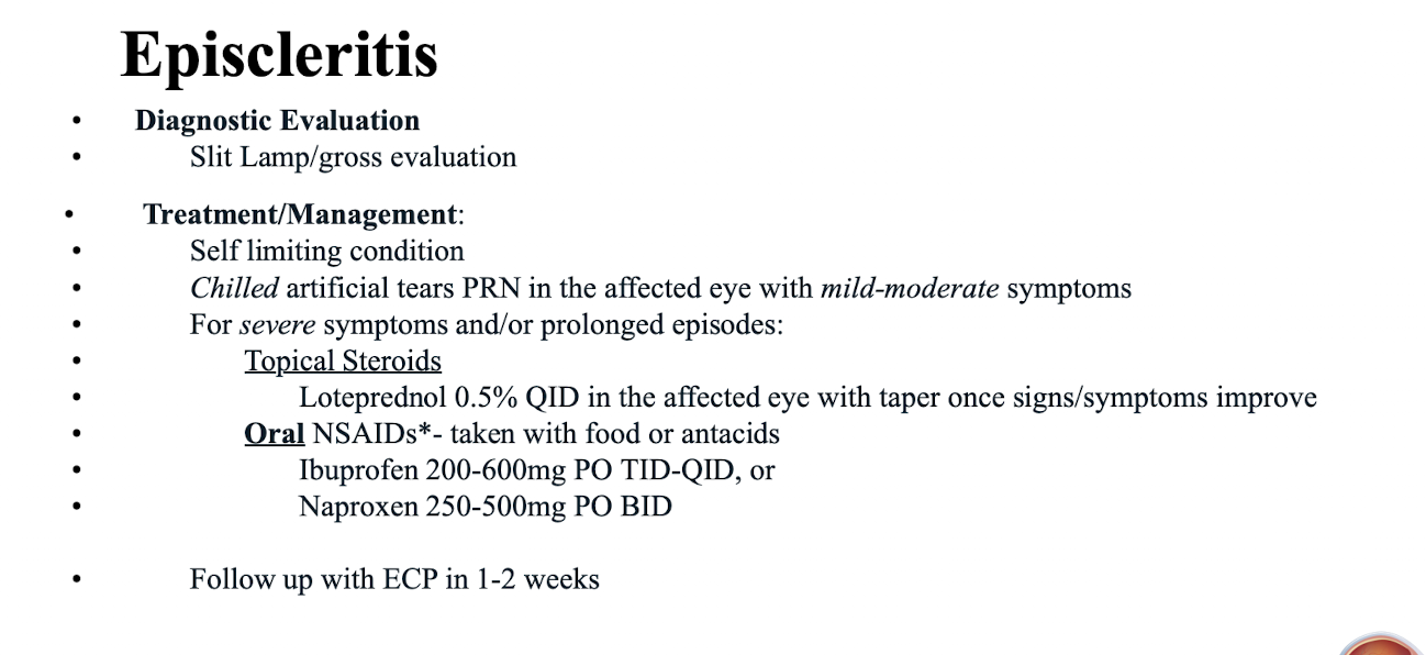 Topical Steroids (Loteprednol 0.5% QID in the affected eye with taper once signs/symptoms improve); Oral NSAIDs*- taken with food or antacids (Ibuprofen 200-600mg PO TID-QID; or Naproxen 250-500mg PO BID).