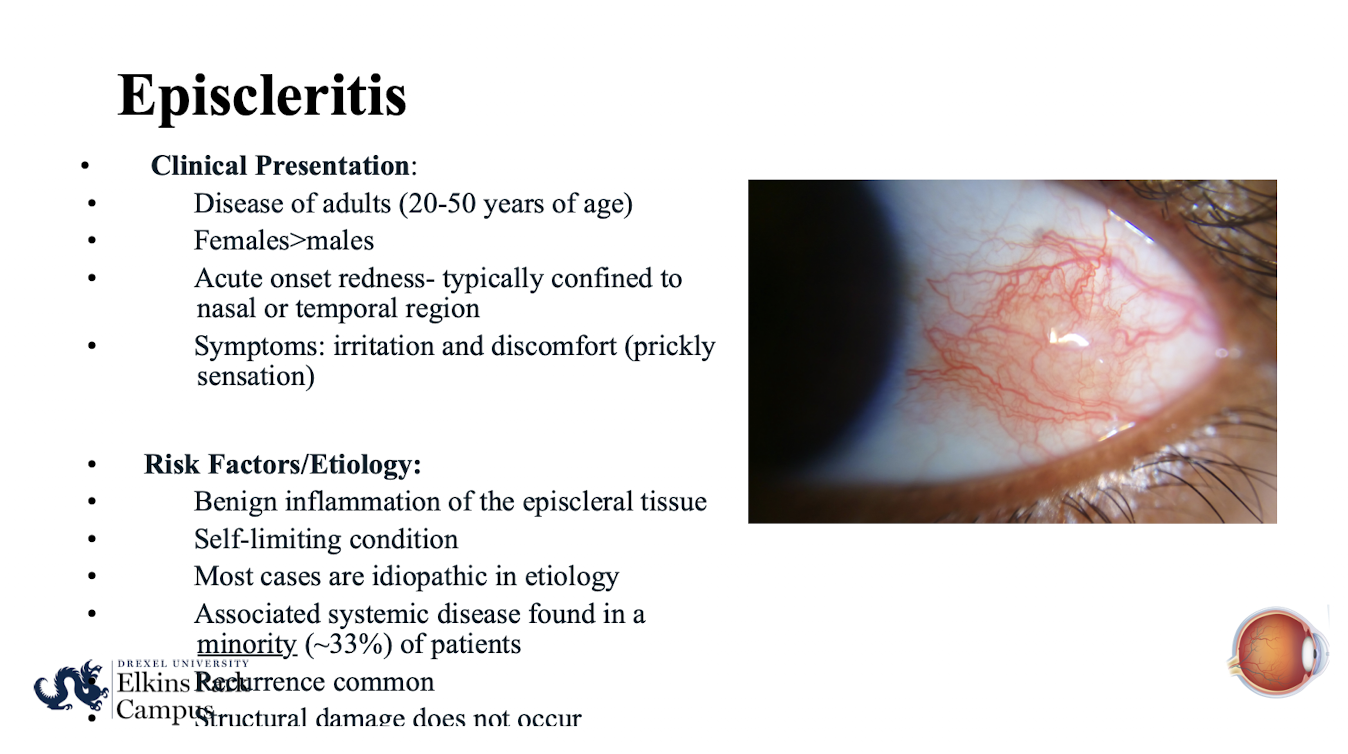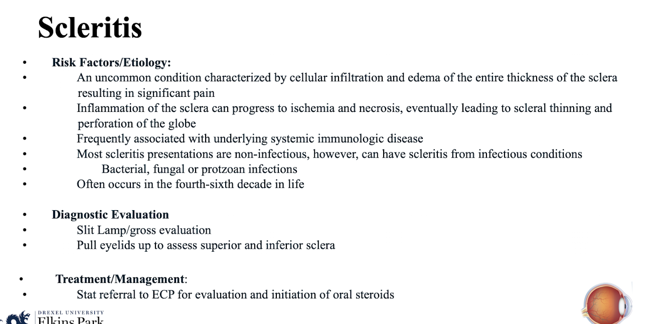 Bacterial; fungal or protzoan infections. However most scleritis presentations are non-infectiousand it often occurs in the 4-6th decade of life