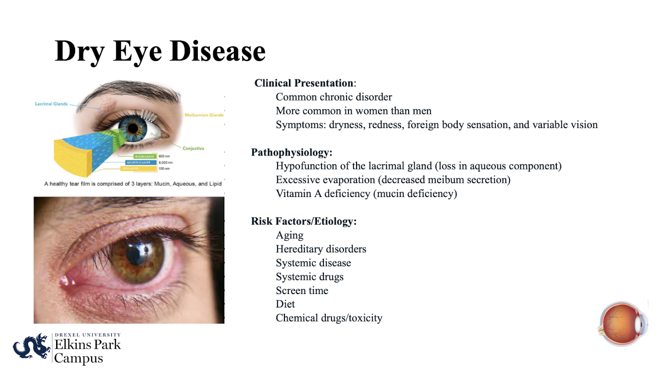 Aging; hereditary disorders; systemic disease; systemic drugs; screen time (you blink less); diet; chemical drugs/toxicity.