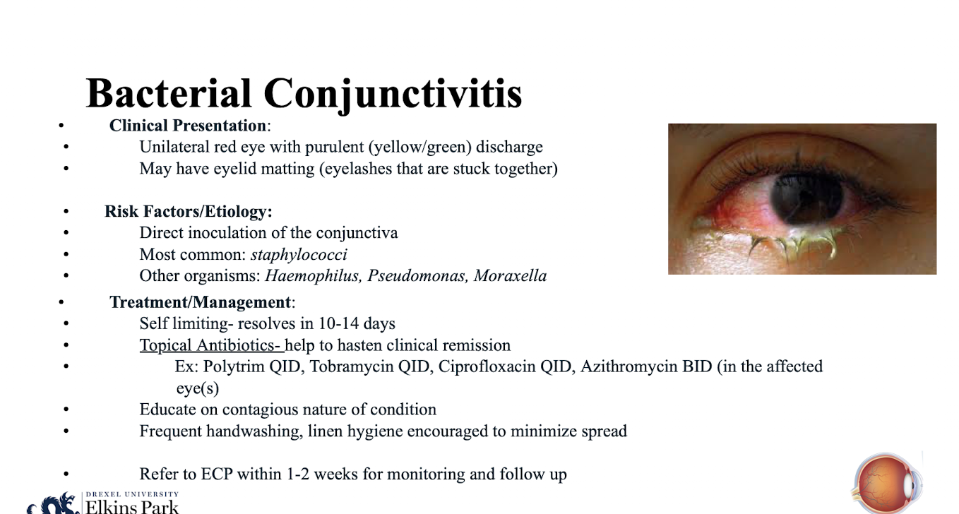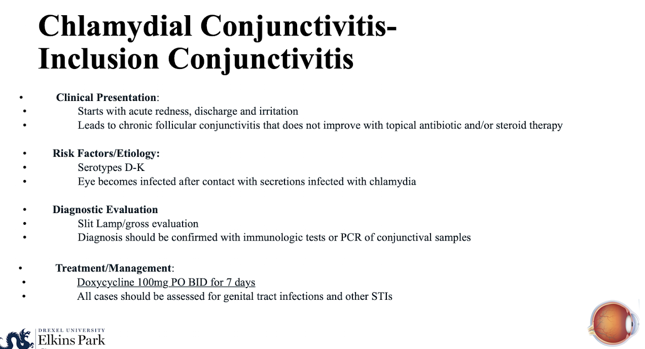 Starts with acute redness; discharge and irritation; leads to chronic follicular conjunctivitis that does not improve with topical antibiotic and/or steroid therapy