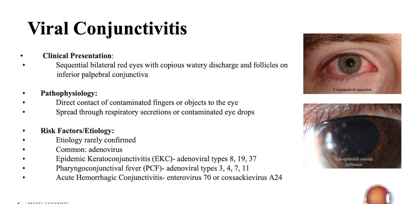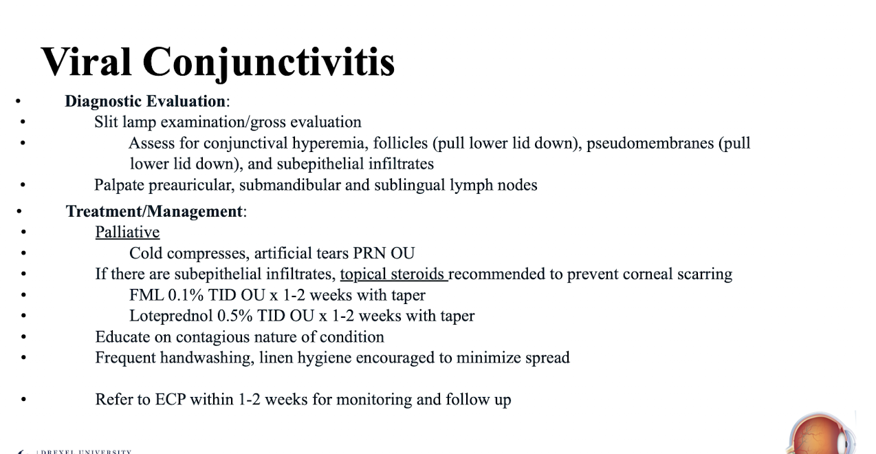 Conjunctival hyperemia; follicles (pull lower lid down); pseudomembranes (pull lower lid down); and subepithelial infiltrates