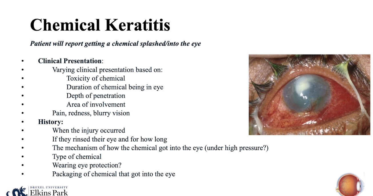 Toxicity of chemical; Duration of chemical being in eye; Depth of penetration; Area of involvement.