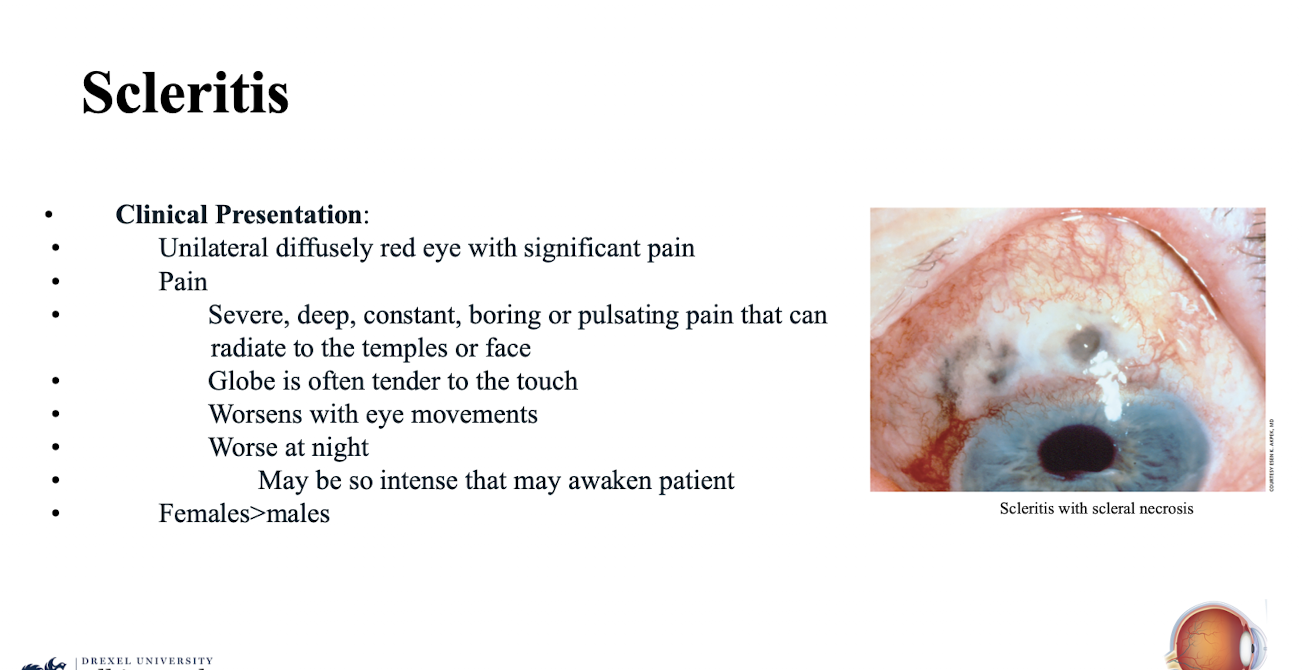 What is the clinical presentation of Scleritis regarding redness and pain?
