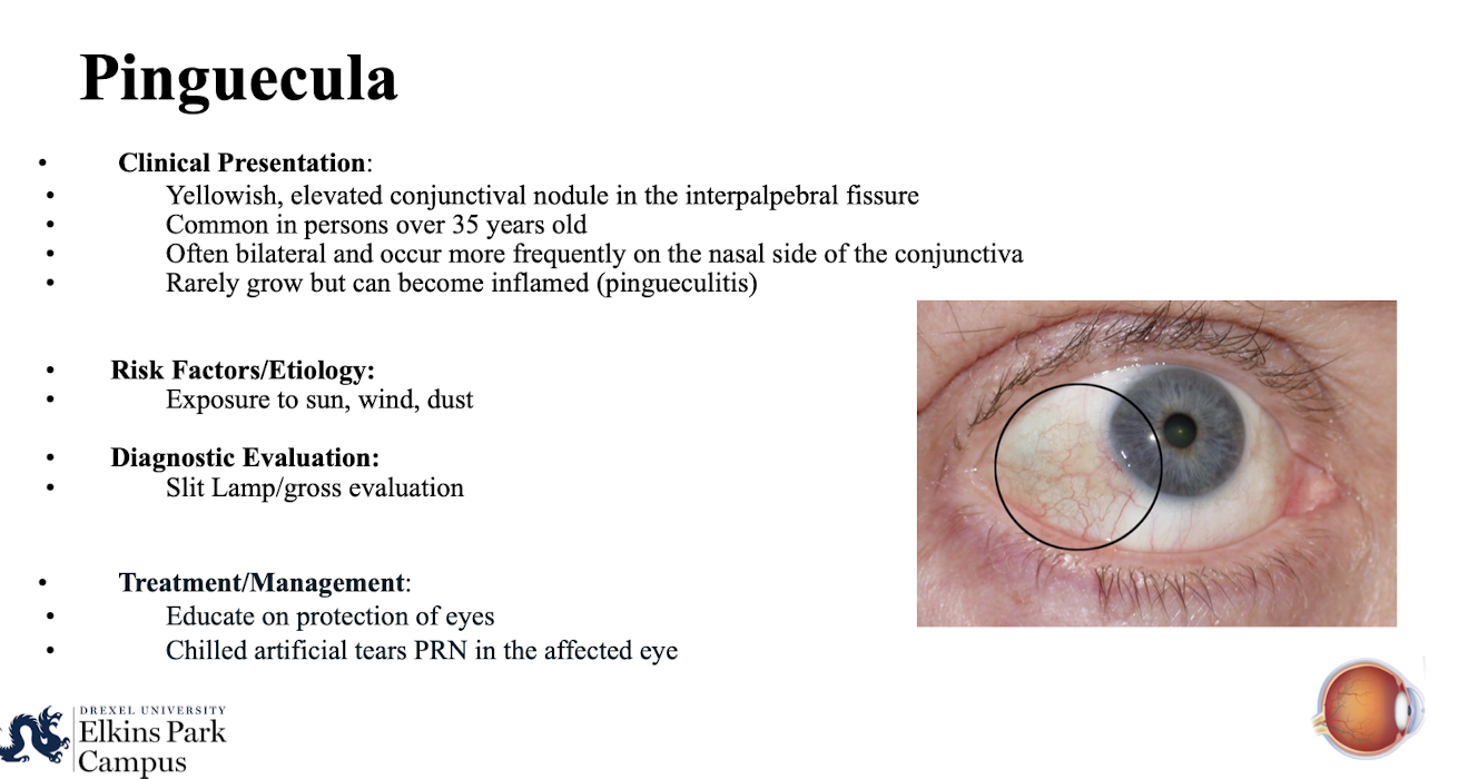 Yellowish; elevated conjunctival nodule in the interpalpebral fissure. Common in persons over 35 years old
