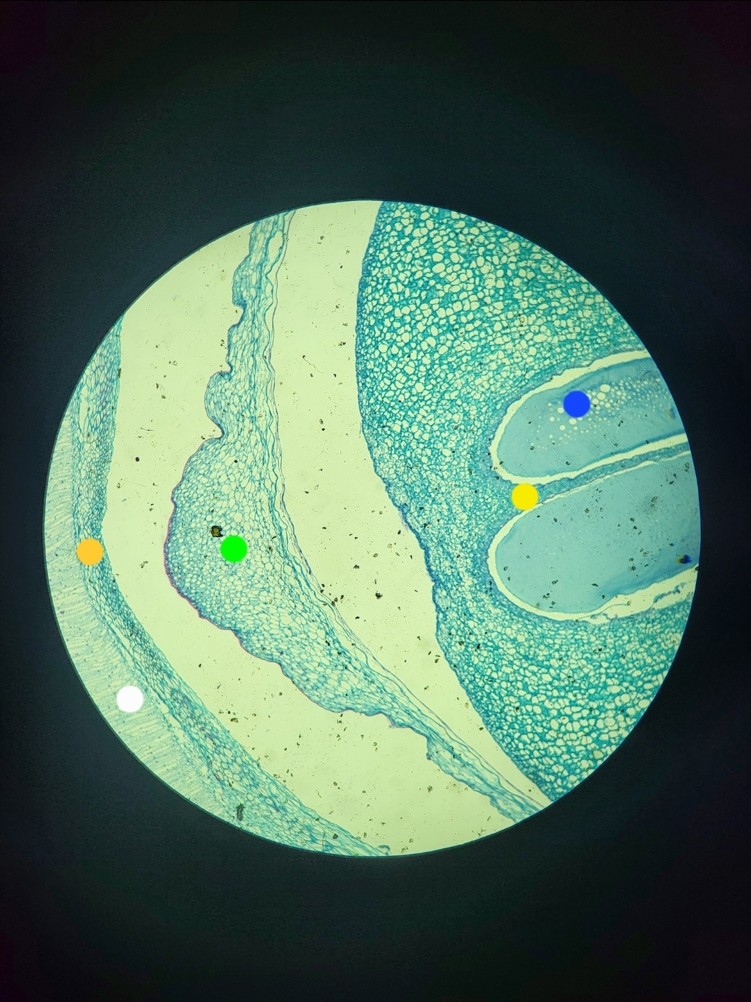 green: megasporangium; yellow: archegonia; blue: egg; pinkish: integument; orange: micropyle (check atlas for better pic of last two)