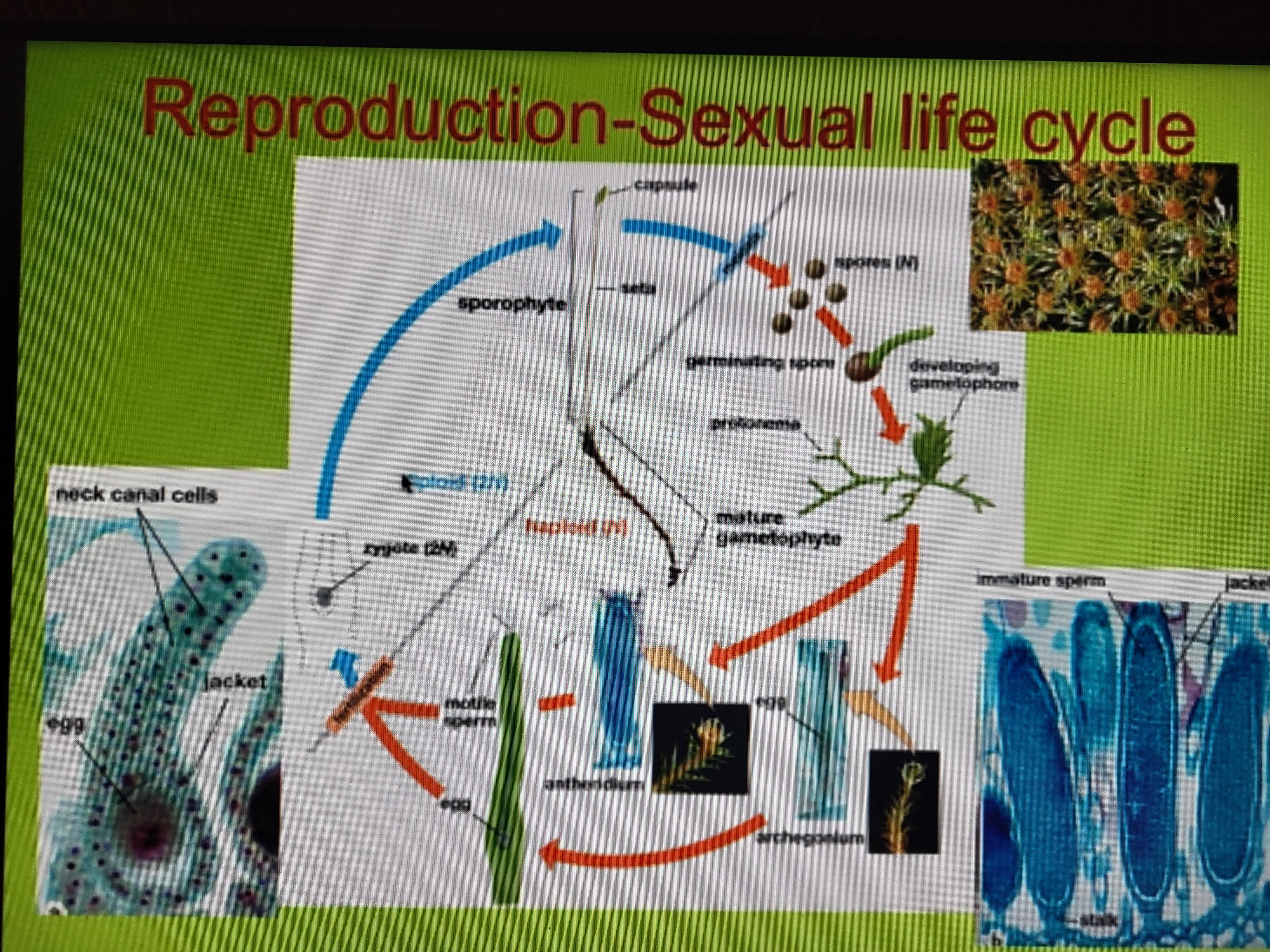 diploid stage: fertilization produces zygote; becomes sporophyte with capsule and seta attached to haploid mature gametophyte