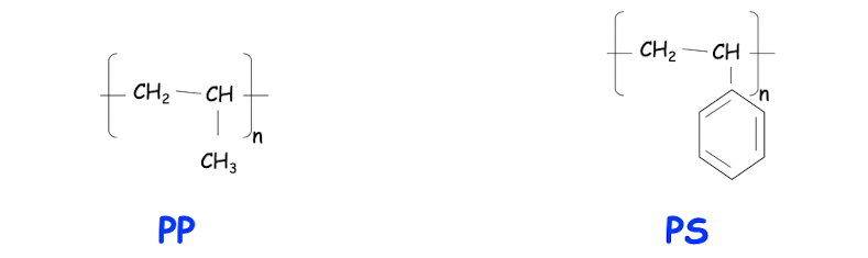 PP (the methyl group on every other carbon brings more interference to rotation than the small hydrogen atoms of the PE)