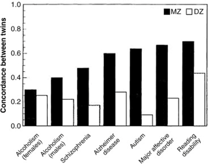 There is a very large discrepancy between concordance between monozygotic (MZ) twins and dizygotic (DZ) twins.