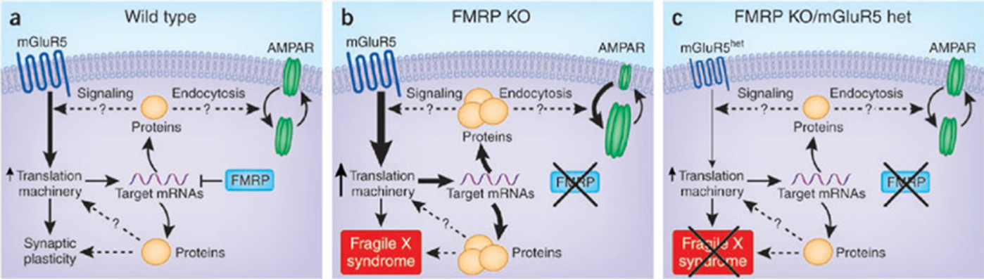 By removing FMRP causes an overreaction of cells to MGLUR5 activation and more proteins are upregulated that promote endocytosis of AMPA receptors causing a weakening of synapses.