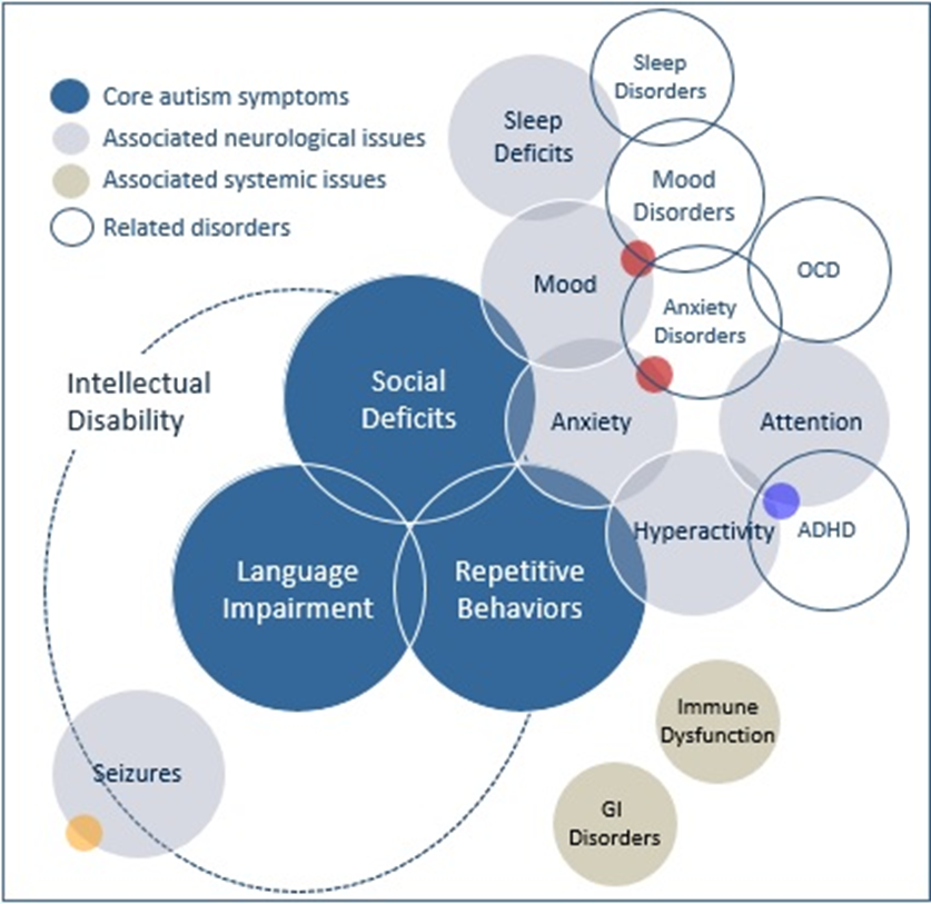 Which brain areas are implicated in the core edificits of autism. Mention what category of symptoms they affect