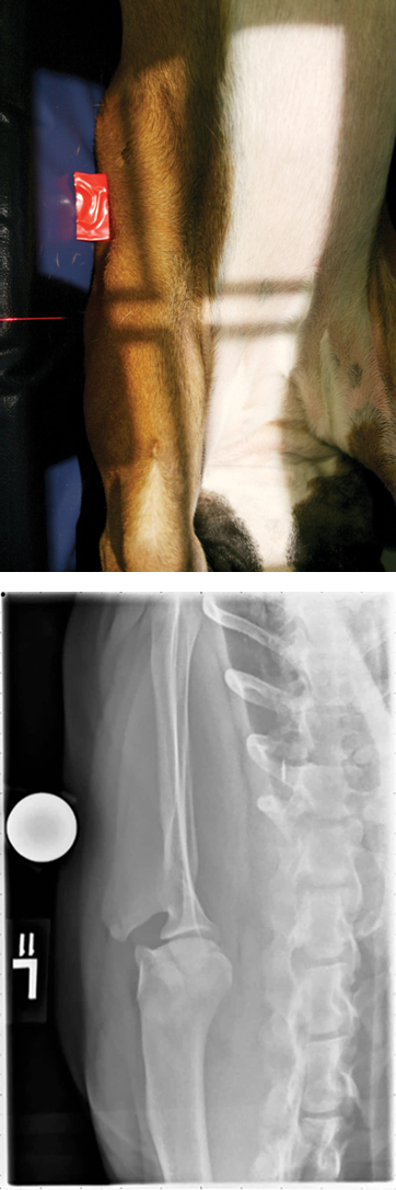 The dog is in lateral recumbency with the leg to be imaged against the table