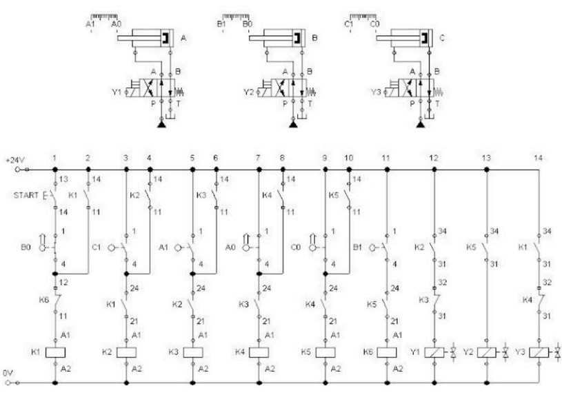 In circuit, what will be the effect in the sequence if limit switch C1 is not activating (contact is always open)? START button is pressed.