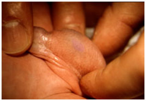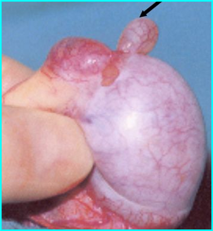 Usually have tenderness over the upper pole of the testis. Early torsion of the ______ _______may present with a pathognomonic “blue dot sign” (bluish discoloration seen through the scrotal skin).