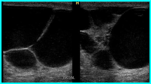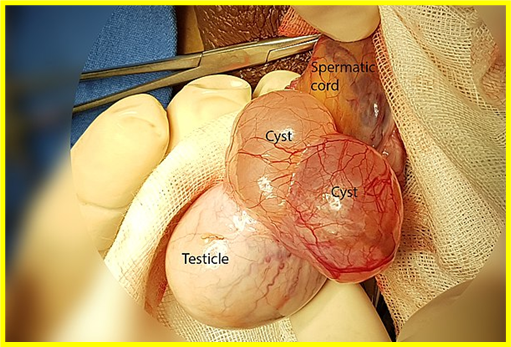 Dilation of rete ducts & seminiferous tubules. They contain clear fluid & sperm.