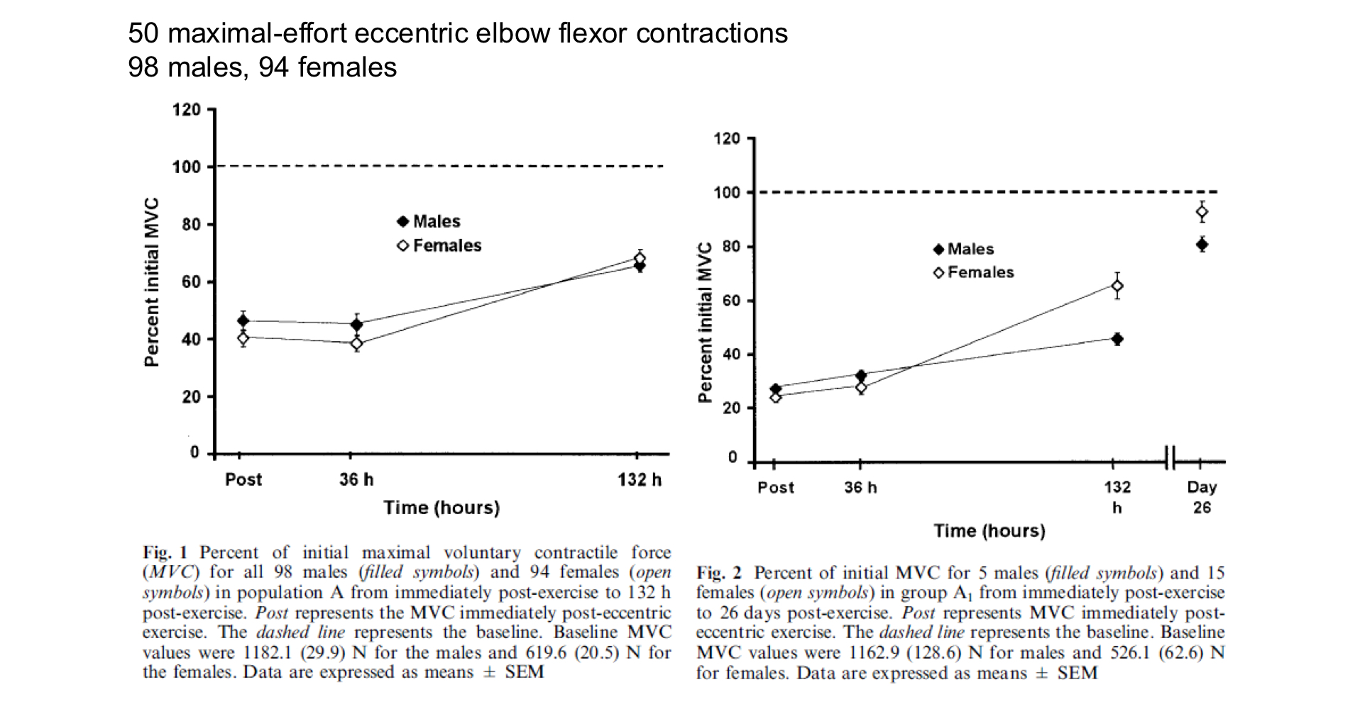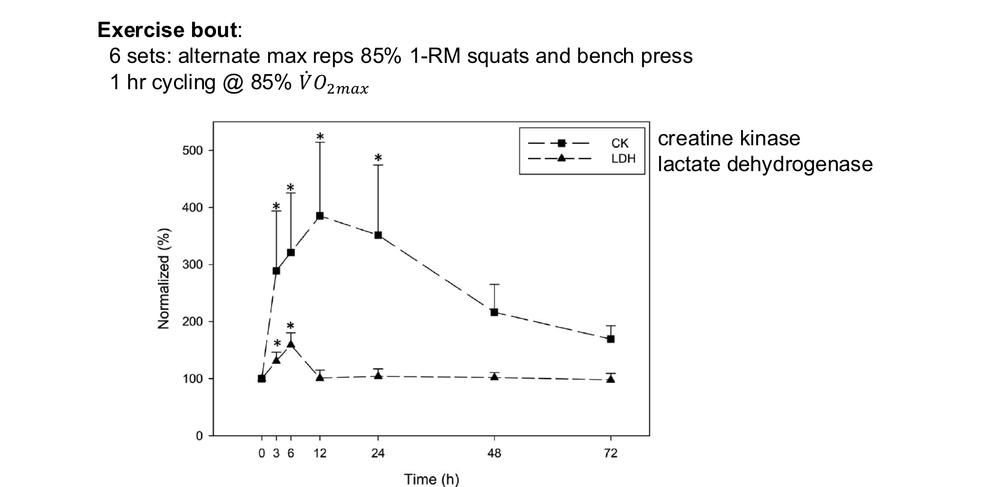 Muscle damage and delayed-onset muscle soreness (DOMS - feel 24-48 hrs and then gets worse over a couple days)