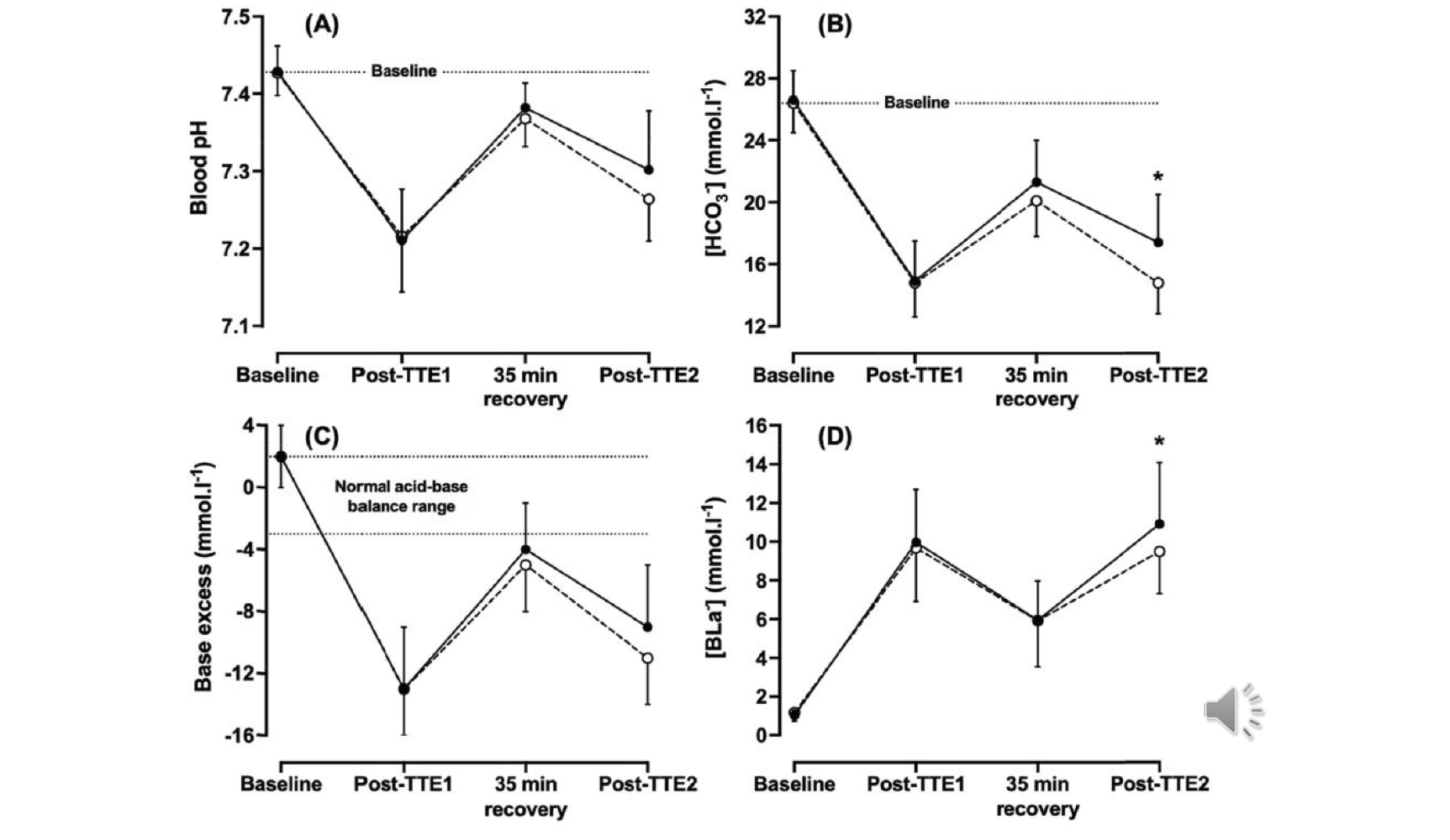 Blood pH, bicarbonate, lactate levels following time-to-exhaustion tests with 35 min recovery between